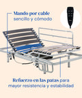 • Cama articulada: Somier eléctrico con estructura de acero reforzado y lamas anchas de madera para un apoyo seguro. Se regula fácilmente con mando por cable, permitiendo articular respaldo y piernas con total comodidad. Compatible con accesorios opcionales.